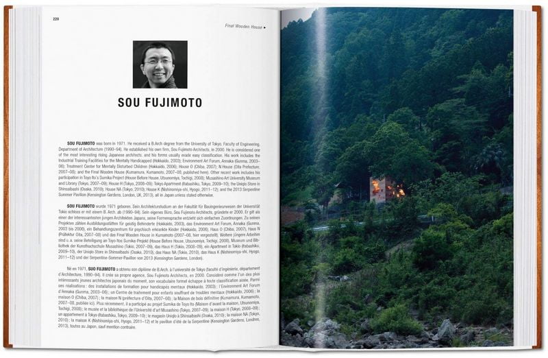 True to all TASCHEN architecture titles, the book pays tribute to many emerging international talents as well as to such renowned figures as Tadao Ando to Renzo Piano. It celebrates each architect’s vision and innovation, as well as investigating the techniques, trends, and principles that have informed their work with wood. It examines the computer guided milling that has allowed for novel new forms, the responsible harvesting that allows wood to align with our environmental concerns, and, above all, wood’s enduring appeal to our senses and psyche, comforting hectic modern lives with a sense of Arcadian simplicity.