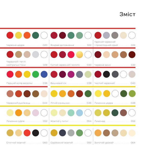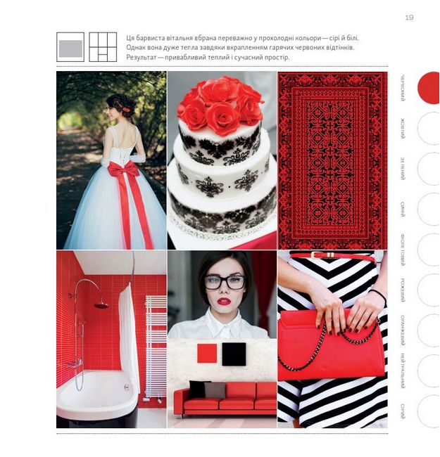 Тут ви знайдете понад 1000 ідей поєднання кольорів для будь-якого аспекту вашого життя — від декорування оселі до моди, від оформлення весілля до прикрашання тортів. Кожен розділ присвячено одній із базових груп кольорів, яка включає низку відтінків — від основних яскравих до найвитонченіших пастельних.