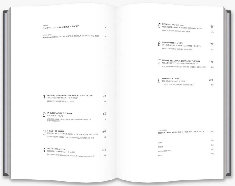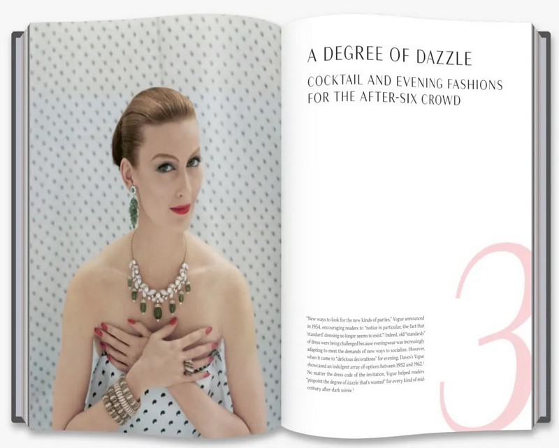 В журнале Vogue 1950-х годов, состоящем из многогранных тематических разделов, представлены тщательно отобранные фотографии, иллюстрации и развороты из архивов Vogue (как со знаковыми изображениями, так и с менее известными ), а также неопубликованные фотографии и письма из личных архивов Джессики Дейвс.