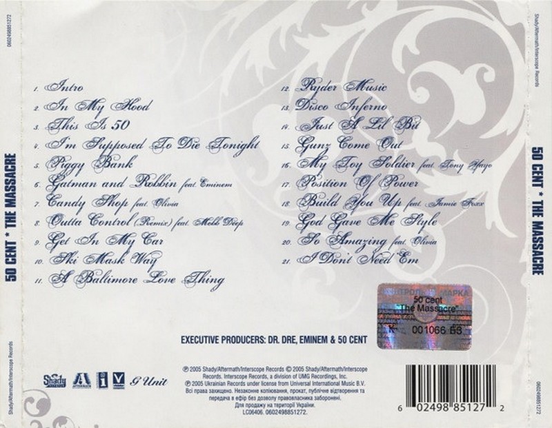 Фірмовий диск (CD)The Massacre is the second studio album by American rapper 50 Cent, released on March 3, 2005, via Interscope Records, Eminem's Shady Records, 50 Cent's G-Unit Records, and Dr. Dre's Aftermath Entertainment. With production from Dr. Dre, Eminem, Scott Storch, Sha Money XL and others, the album features guest appearances from G-Unit affiliates Tony Yayo, Olivia, Eminem and Jamie Foxx.