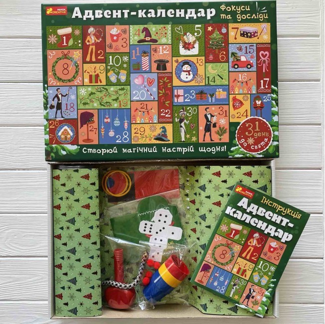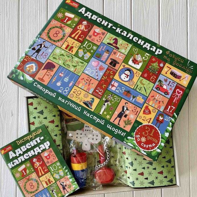 «Адвент-календар. Фокуси та досліди» - це новорічний подарунковий набір, який 100% зацікавить як дітей, так і дорослих! Створюємо своїм близьким справжнє новорічне магічне шоу!31 день розваг гарантовано!