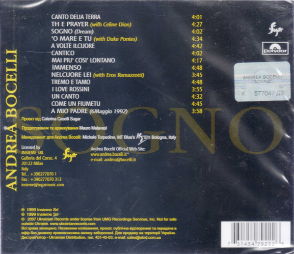 Якщо вам подобається музика, яка зачаровує і залишає глибокий слід у вашому серці, то альбом "Sogno" від незрівнянного Andrea Bocelli – це те, що необхідно додати до вашої колекції. Випущений у 2007 році на лейблі Polydor, цей альбом є справжньою перлиною в жанрі Pop і стилях Ballad;Vocal.