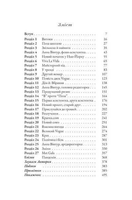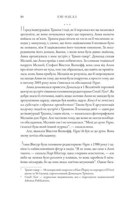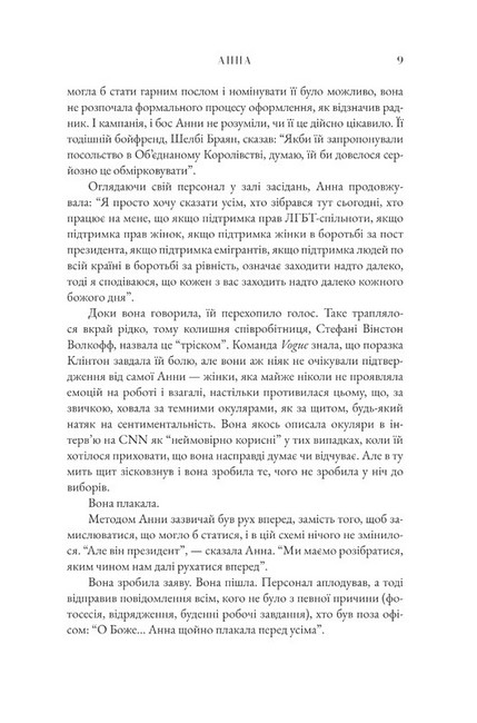 “Анна. Біографія” Емі Оделл — одна з небагатьох варіацій біографії Анни Вінтур, головної редакторки Vogue, яка стала прототипом героїні для славнозвісного фільму “Диявол носить Prada”. Емі Оделл мала власний досвід співпраці з Анною, а у процесі роботи над книгою зібрала інформацію із 250 інтерв’ю та свідчень від колег, друзів та найближчого оточення Анни Вінтур. З книги читач дізнається, що саме допомогло Анні Вінтур досягти висот, вистояти в часи криз, втримати і розвинути індустрію медіа світової моди. Авторка вибудовує сюжет довкола характеру Анни і розказує, як вона стала головною людиною світу моди та Vogue, витримавши жорстку конкуренцію з чоловіками бізнесу і політики.The New York Times відзначав, що “Анна. Біографія” — найбільш відвертий і повний портрет Анни Вінтур.
