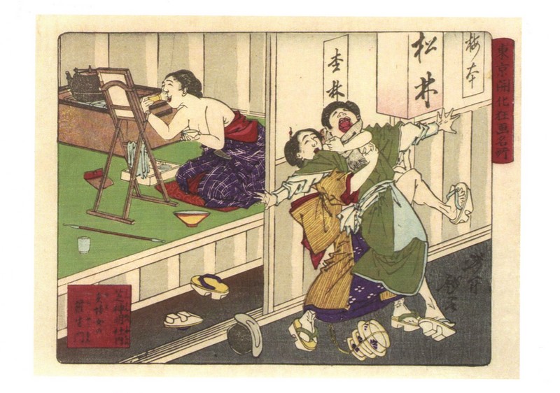 Archery Attendants Grabbing a Client at the Shinmei Shrine in Shiba, from the series Comic Pictures