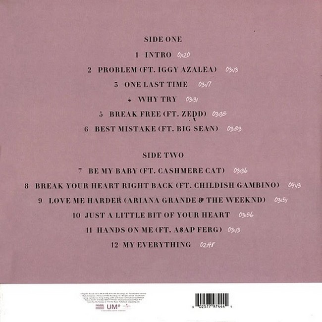 Альбом "My Everything" став вирішальним у кар'єрі Grande, закріпивши її статус мегазірки у світовій попкультурі. З яскравими хітами, як "Problem", "Break Free", та інти́мним "Love Me Harder", цей альбом зміг торкнутися самісінького серця попмузики. У цій платівці кожен трек - це історія, наповнена емоціями та досвідом.