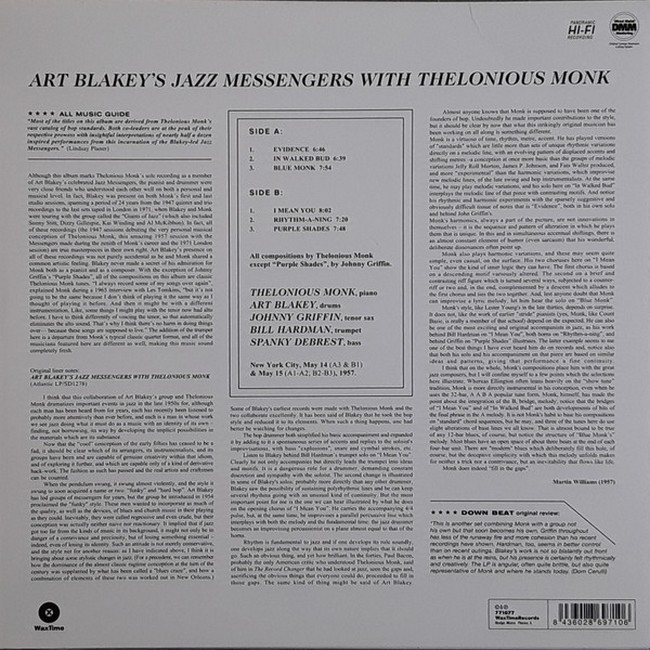 Фірмова вінілова платівка (VINYL)Art Blakey's Jazz Messengers with Thelonious Monk is a studio album released in 1958 by Atlantic Records. It is a collaboration between the Jazz Messengers, the group led by drummer Art Blakey, and Thelonious Monk on piano.