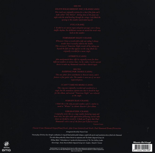 Death Walks Behind You is the second studio album by British rock band Atomic Rooster, released in September 1970. It was their first album to receive a US release, albeit in a different sleeve. It is commonly thought of as the archetypal Atomic Rooster album, recorded by the 'classic' line-up of Vincent Crane, John Du Cann and Paul Hammond. It is certainly, critically and commercially, their most successful album and often hailed as a classic of the progressive rock genre. It also produced the hit single "Tomorrow Night" (UK No. 11), which became one of the band's best-known songs. The album's cover features the William Blake monotype Nebuchadnezzar. Band photos were taken at Churchfield Road Cemetery, Acton W3, by former actor-turned photographer, Richard Lyon.