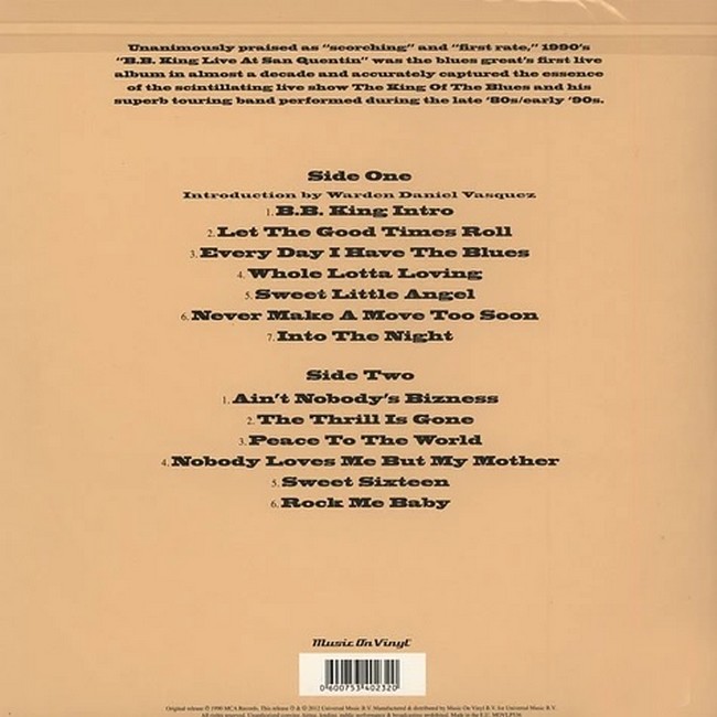 Фірмова вінілова платівка (VINYL)Live at San Quentin is a 1990 live album by blues guitarist B.B. King performed at San Quentin State Prison in Marin County, California.