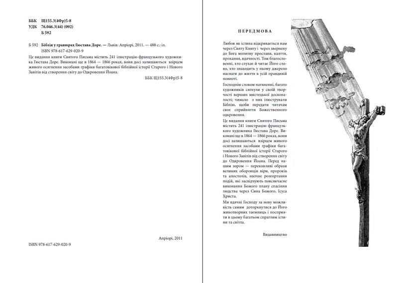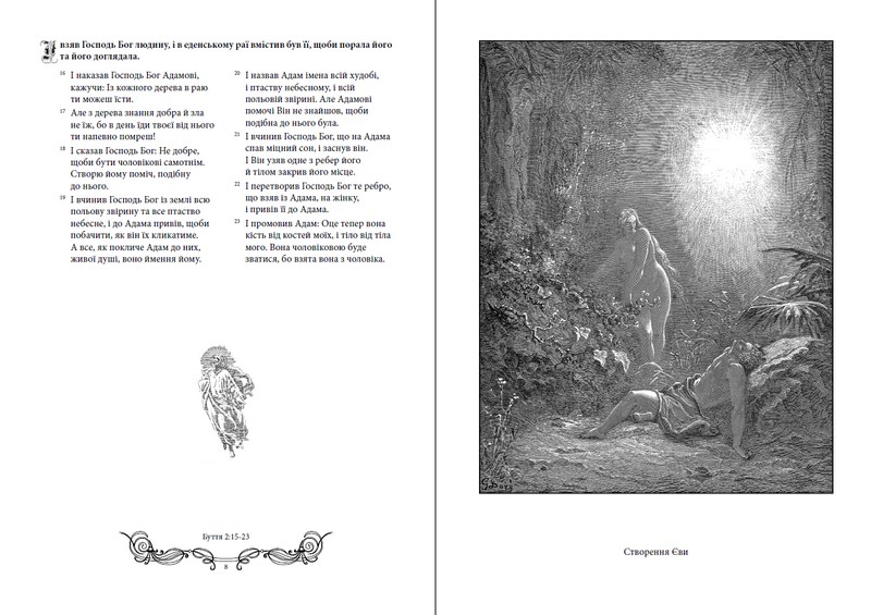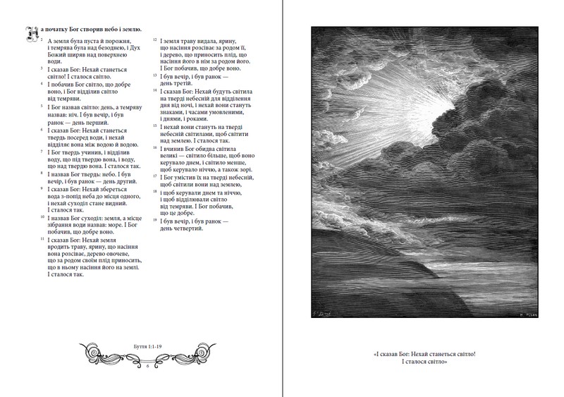 Це видання Святого Письма містить 241 ілюстрацію французького художника Гюстава Доре. Виконані ще в 1864 – 1866 роках, вони досі залишаються взірцем живого осягнення засобами графіки багатовікової біблійної історії Старого і Нового Завітів від створення світу до Одкровення Йоана.Видання містить епізоди зі Святого Письма.
