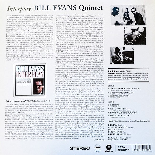 Фірмова вінілова платівка (VINYL)Interplay is a 1963 album by jazz musician Bill Evans. It was recorded in July 1962 in New York City for Riverside Records. The Interplay Sessions is a 1982 Milestone album that includes the entirety of this album, and tracks recorded for Riverside on August 21 and 22 of the same year with a different lineup (with Zoot Sims and Ron Carter, and without Freddie Hubbard and Percy Heath).
