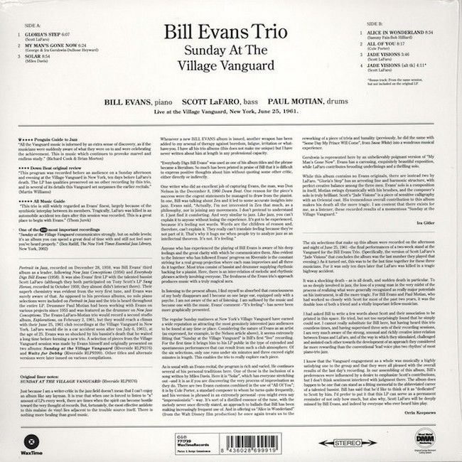 Фірмова вінілова платівка (VINYL)Sunday at the Village Vanguard is a live album by jazz pianist and composer Bill Evans and his Trio consisting of Evans, bassist Scott LaFaro, and drummer Paul Motian. Released in 1961, the album is routinely ranked as one of the best live jazz recordings of all time.