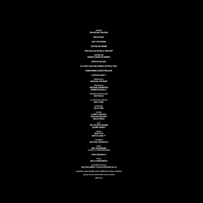 The title track, a fictionalized retelling of Joel's experiences with people he met as a lounge singer in Los Angeles, peaked at No.?25 on the US Billboard Hot 100 and No.?4 on the Adult Contemporary singles chart. "Travelin' Prayer" and "Worse Comes to Worst" peaked at No. 77 and 80 on the Hot 100, respectively, while the album itself peaked at No.?27 on the US Billboard 200. The album was certified gold by the RIAA in 1975, but Joel received only $8000 in royalties (US$43,508 in 2022 dollars).