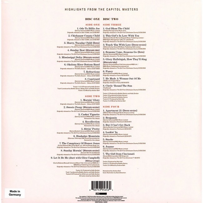 Фірмова вінілова платівка (VINYL)The Girl from Chickasaw County: The Complete Capitol Masters is an out-of-print 8-disc box set compilation album by singer-songwriter Bobbie Gentry. It was released on September 21, 2018, by Capitol and UMe. It features Gentry’s entire recording career with Capitol Records, bringing together 7 studio albums, 75 previously unreleased tracks, including demos, alternate takes and live recordings from Gentry's BBC television series.