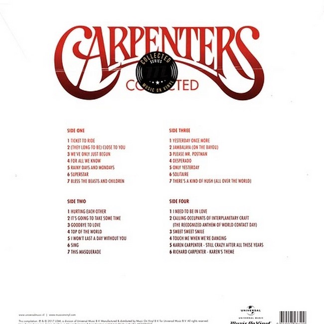 Фірмова вінілова платівка (VINYL)The Carpenters, officially known as Carpenters, were an American vocal and instrumental duo consisting of siblings Karen (1950–1983) and Richard Carpenter (born 1946). They produced a distinctive soft musical style, combining Karen's contralto vocals with Richard's harmonizing, arranging, and composition skills. During their 14-year career, the Carpenters recorded 10 albums along with many singles and several television specials.