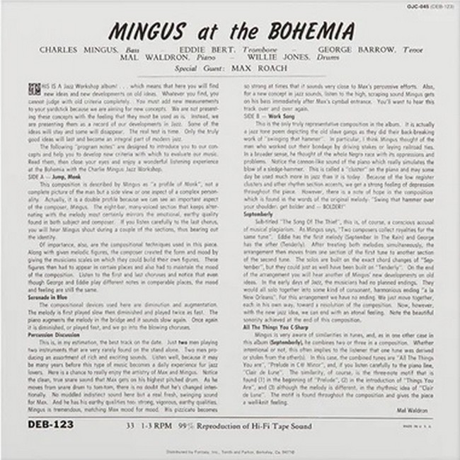 Фірмова вінілова платівка (VINYL)Mingus at the Bohemia is a live album by the jazz composer and bassist Charles Mingus. It was released in August 1956 through Mingus's own label Debut Records. It was recorded at Cafe Bohemia in New York City on December 23, 1955. Max Roach makes a guest appearance on one track. Other recordings from the same performance were released in 1964 under the title The Charles Mingus Quintet & Max Roach.