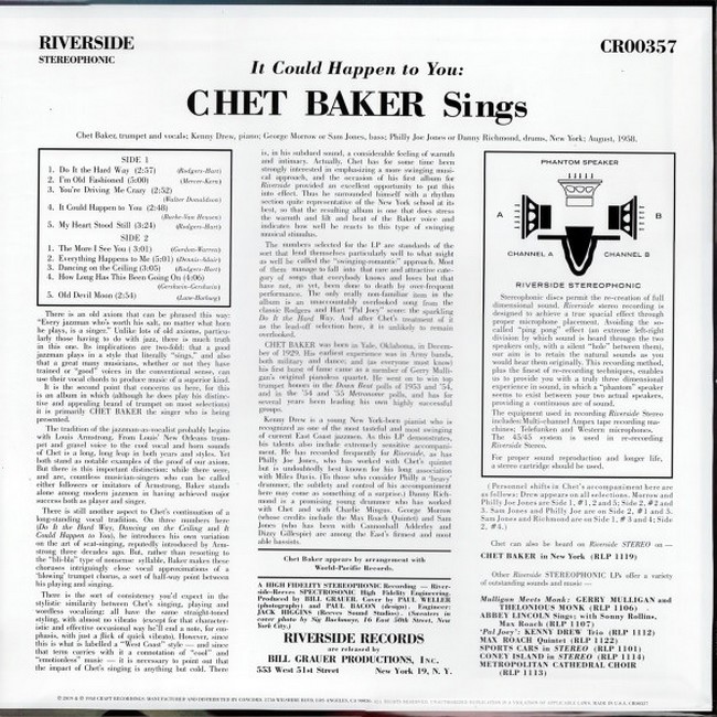 Фірмова вінілова платівка (VINYL)(Chet Baker Sings) It Could Happen to You is an album by jazz trumpeter and vocalist Chet Baker. It follows a formula similar to two other Baker albums, Chet Baker Sings (1954) and Chet Baker Sings and Plays with Bud Shank, Russ Freeman & Strings (recorded in 1955, released in 1964) in which he sings traditional pop standards in a jazzy fashion. Unlike the aforementioned records, on It Could Happen to You, on a few tracks, Baker plays no trumpet whatsoever, opting to scat in place of an instrumental solo.