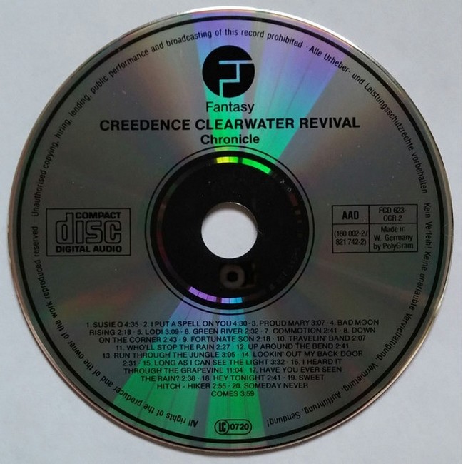 Фірмовий диск (CD)Chronicle, or fully Chronicle: The 20 Greatest Hits, is a greatest hits album by the American rock band Creedence Clearwater Revival. It was released in January 1976 by Fantasy Records. The edited version of "I Heard It Through the Grapevine" featured on the album was simultaneously released as a single.