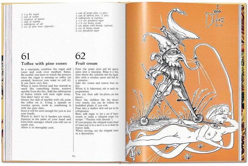 This abridged reissue features 78 of his recipes over 12 chapters, specially illustrated by Dali, and organized by meal courses, including aphrodisiacs. The illustrations and recipes are accompanied by Dali’s extravagant musings on subjects such as dinner conversation: “The jaw is our best tool to grasp philosophical knowledge.”