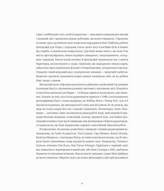 Ця книга — фотоальбом легендарної Енні Лейбовіц, де зібрані її модні фотографії за останні п’ятдесят років. Ви зможете насолодитися 350-ма неймовірними роботами, більшість з яких не публікувалися раніше. У книзі представлені портрети таких видатних особистостей як: Ніколь Кідман, Серени Вільямс, Піни Бауш, РуПола, Леді Гаги, Королеви Єлизавети, Ненсі Пелосі та багатьох інших. А ще тут ви знайдете передмову від Анни Вінтур, коментарі Енні Лейбовіц та її інтерв’ю з Карен Малліґан.Енні Лейбовіц — американська портретистка, одна з найвидатніших та найвпливовіших фотографок сьогодення. У 70-х вона створила легендарні роботи для Rolling Stone. Пізніше працювала з Vanity Fair, Vogue та над власними проєктами. Енні — учасниця численних фотовиставок та авторка 5 фотоальбомів.