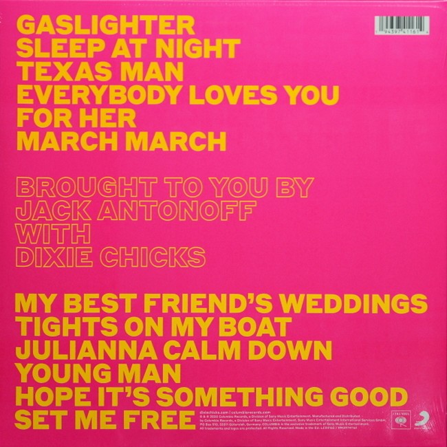 Фірмова вінілова платівка (VINYL)Gaslighter is the eighth studio album by American country band The Chicks. It was released on July 17, 2020, by Columbia Records. Produced by Jack Antonoff and the Chicks, it is the group's first album in fourteen years, and first to be released under their new name (though some physical pressings of the album still carry the "Dixie Chicks" name.) The album was preceded by the release of three singles: "Gaslighter", "Julianna Calm Down", and "March March". The album received critical acclaim.