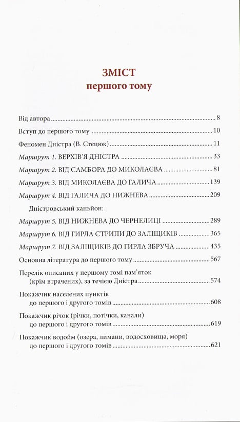 Книжка містить понад півтори тисячі ілюстрацій – сучасних і архівних фотографій, малюнків, картосхем. Перший том охоплює ділянку Дністра від його витоків до гирла Збруча – річки-кордону, що розділяла Австро-Угорську й Російську імперії, "панську" Польщу і Радянський Союз. Найхарактерніші категорії пам’яток для описаної ділянки – це дерев’яні церкви й дзвіниці, забудова історичних містечок, костели і кляштори, маєтки польської шляхти, руїни замків XIV–XVII ст. (Галич, Золотий Потік, Раковець, Чернелиця, Язловець, Червоногород, Новосілка, Кривче, Кудринці, Окопи), пам’ятки княжої доби і музеї, об’єднані у складі Національного заповідника "Давній Галич", австрійські фортифікації часів Першої світової війни, буковинські церкви й монастирі. Маршрути 5–7 присвячені Дністровському каньйону з його стрімкими меандрами, урвистими скелястими берегами, густими лісами, каскадами водоспадів і культовими печерами. Сповнені загадок і каньйоноподібні долини дністровських допливів: Джурина, Стрипи, Серету й Збруча.