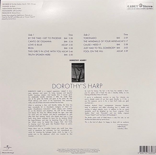 Фірмова вінілова платівка (VINYL)Dorothy's Harp is a studio album by jazz harpist Dorothy Ashby released in 1969 via the Cadet label. A few years after releasing Dorothy’s Harp, she started working with Stevie Wonder. The record includes two Brazilian-touched compositions: "Reza" and "Canto de Ossanha". The album was re-released as a CD in 2006.