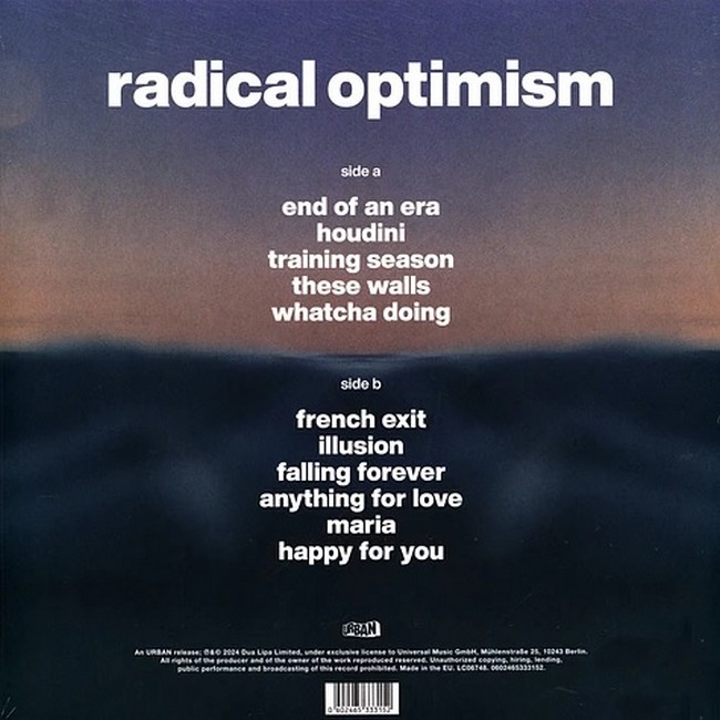Фірмова вінілова платівка (VINYL)Radical Optimism is the third studio album by English-Albanian singer Dua Lipa, released on 3 May 2024 by Warner Records. It is her first full-length studio album release in four years since Future Nostalgia (2020). Lipa worked on Radical Optimism with producers such as Kevin Parker, Danny L Harle, Ian Kirkpatrick, and Andrew Wyatt. The album was preceded by three singles: "Houdini", "Training Season", and "Illusion".