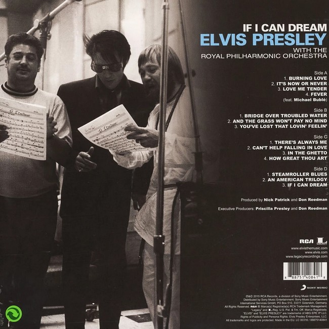 Фірмова вінілова платівка (VINYL)If I Can Dream is a compilation album by American singer Elvis Presley. It was released on October 30, 2015 by RCA Records and Legacy Recordings. The album features archival vocal recordings of Presley accompanied by new orchestral arrangements by the Royal Philharmonic Orchestra. It also features duets with Canadian singer Michael Buble and Italian trio Il Volo. If I Can Dream was recorded at Abbey Road Studios in London, England, and it was produced by Nick Patrick and Don Reedman, with piano orchestration (and assistant musical director duties on the accompanying world tour) by Dominic Ferris.