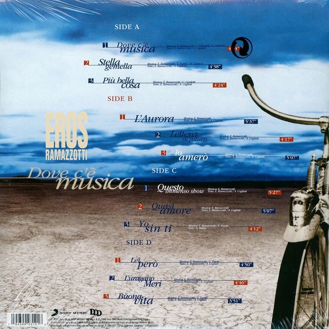 Фірмова вінілова платівка (VINYL)Dove c'e musica (Where There Is Music) is the seventh studio album by Italian pop/rock singer Eros Ramazzotti, released in 1996 on the BMG label. It is Ramazzotti's first self-produced album and the first without any involvement from long-time collaborator Piero Cassano. Dove c'e musica was Ramazzotti's most successful album to that point, topping the Albums chart in six countries including Italy and Germany.