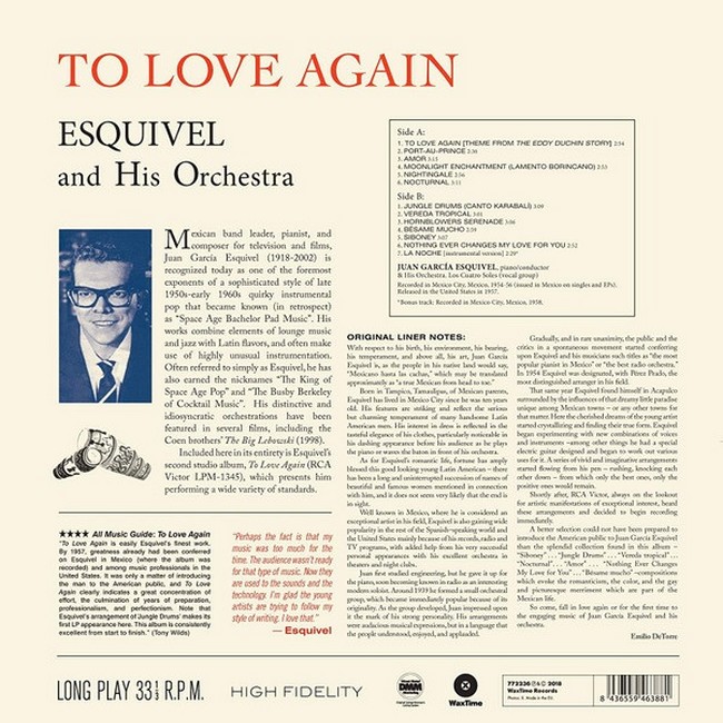 Фірмова вінілова платівка (VINYL)Juan Garcia Esquivel (January 20, 1918 – January 3, 2002), often known mononymously as Esquivel!, was a Mexican band leader, pianist, and composer for television and films. He is recognized today as one of the foremost exponents of a sophisticated style of largely instrumental music that combines elements of lounge music and jazz with Latin flavors. Esquivel is sometimes called "The King of Space Age Pop" and "The Busby Berkeley of Cocktail Music", and is considered one of the foremost exponents of a style of late 1950s-early 1960s quirky instrumental pop that became known (in retrospect) as "Space Age Bachelor Pad Music".