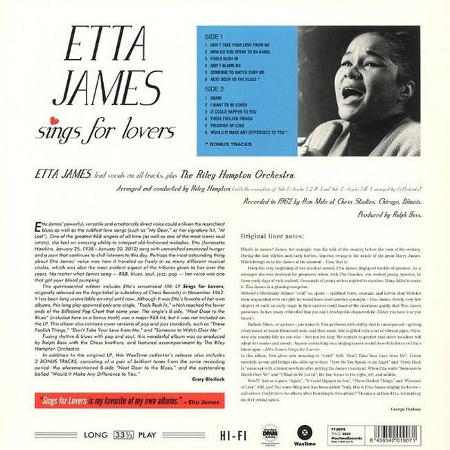 Фірмова вінілова платівка (VINYL)Etta James Sings for Lovers is the fourth studio album by American Blues artist, Etta James. The album was released on Argo Records in 1962 and was produced by Phil and Leonard Chess. The arrangements were by Al Poskonka and Riley Hampton.