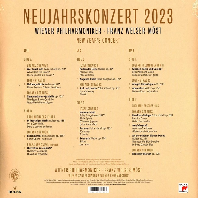 Фірмова вінілова платівка (VINYL)The Vienna New Year's Concert (Neujahrskonzert der Wiener Philharmoniker) is an annual concert of classical music performed by the Vienna Philharmonic on the morning of New Year's Day in Vienna, Austria. The concert occurs at the Musikverein at 11:15. The orchestra performs the same concert programme on 30 December, 31 December, and 1 January but only the last concert is regularly broadcast on radio and television.