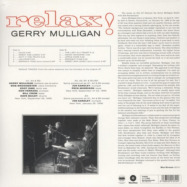 Фірмова вінілова платівка (VINYL)Gerald Joseph Mulligan (April 6, 1927 – January 20, 1996), also known as Jeru, was an American jazz saxophonist, clarinetist, composer and arranger. Though primarily known as one of the leading jazz baritone saxophonists—playing the instrument with a light and airy tone in the era of cool jazz—Mulligan was also a significant arranger working with Claude Thornhill, Miles Davis, Stan Kenton, and others.