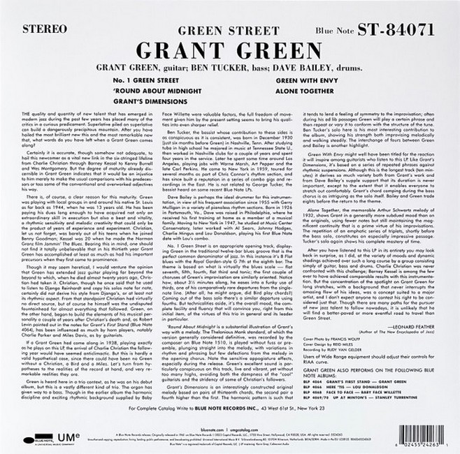 Фірмова вінілова платівка (VINYL)Green Street is an album by American jazz guitarist Grant Green featuring performances recorded and released on the Blue Note label in 1961. Green is backed by bassist Ben Tucker and drummer Dave Bailey. The CD reissue features two alternate takes from the same session as bonus tracks.
