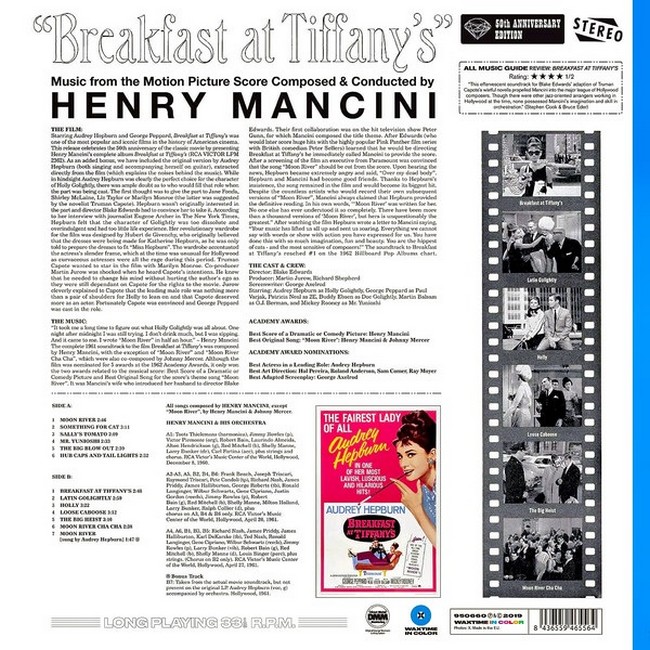 Фірмова вінілова платівка (VINYL)Breakfast at Tiffany's: Music from the Motion Picture is the soundtrack from the 1961 movie Breakfast at Tiffany's starring Audrey Hepburn. The tracks were re-arranged parts of the film music composed and conducted by Henry Mancini. At the 1962 Academy Awards, Mancini and lyricist Johnny Mercer won Oscars for Best Original Song for "Moon River", while Mancini picked up a second statue for Best Original Score. The album also stayed on Billboard's album charts for over ninety weeks.