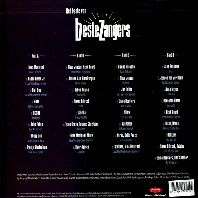 Фірмова вінілова платівка (VINYL)Beste Zangers, formerly De beste zangers van Nederland (English: The Best Singers (of the Netherlands)), is a Dutch reality television show by public broadcaster AVROTROS (a merger of AVRO and TROS, both part of the Netherlands Public Broadcasting). The first series was aired between 5 July and 30 August 2009 and was hosted by Edsilia Rombley. She was first replaced by singer and actor Victor Reinier (2010, 2011) before Jan Smit became the permanent host from 2012 to 2019.