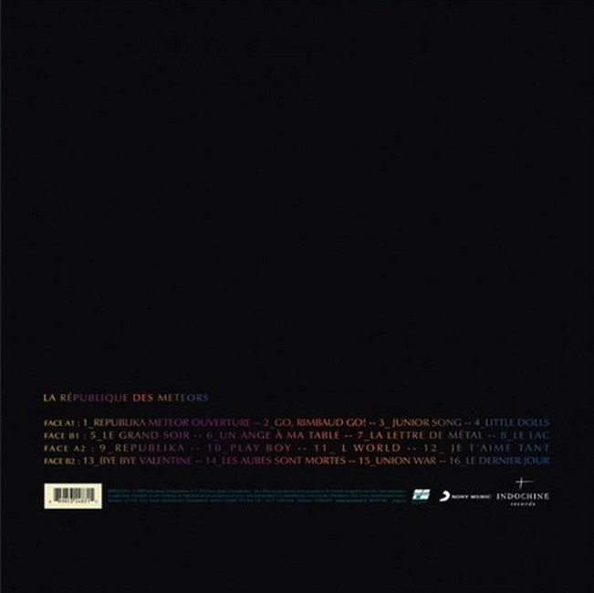 Фірмова вінілова платівка (VINYL)La Republique des Meteors (The Republic of Meteors) is the eleventh studio album by French band Indochine. It was released on 9 March 2009, in France. It peaked at #2 on the French Albums Chart and was certified Platinum in France.