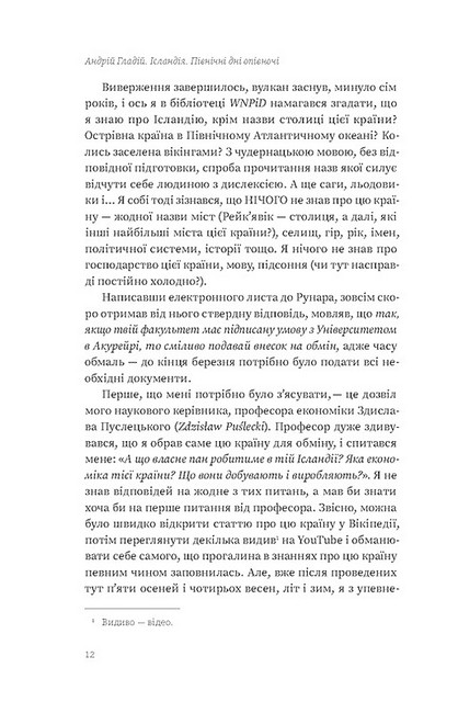 Північне сяйво, затишні різнобарвні хатинки посеред скель, вулкани й льодовики з назвами, які неможливо вимовити з першого разу. Це, мабуть, усе, що зринає в пам?яті, коли мова заходить про Ісландію. Просто таємнича країна на півночі…Андрій Гладій у своїй книжці «Ісландія. Північні дні опівночі» знайомить нас із країною по-справжньому.