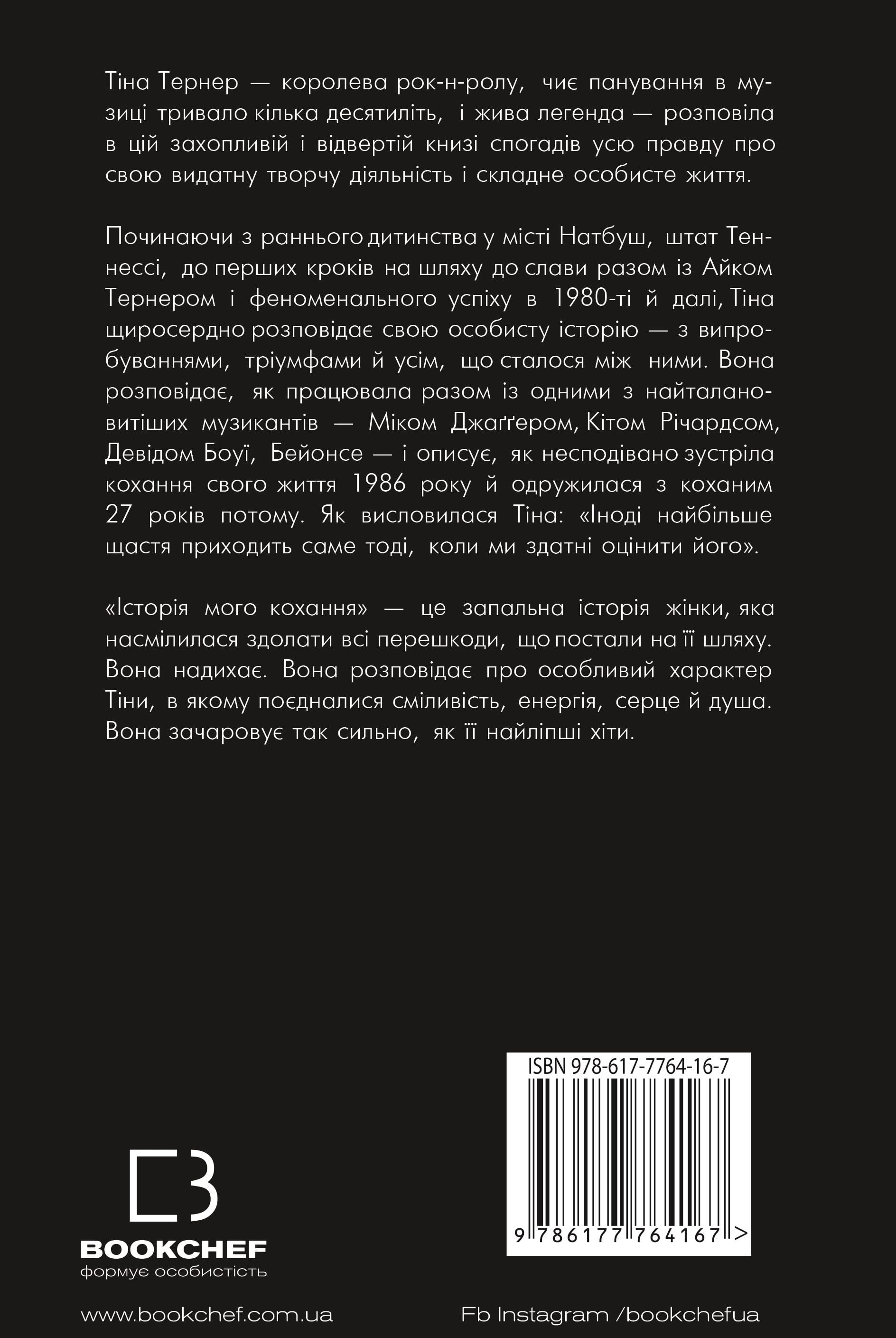 Тіна Тернер — королева рок-н-ролу, чиє панування у музиці тривало кілька десятиліть, і жива легенда — розповіла у цій захопливій і відвертій книзі спогадів усю правду про свою видатну творчу діяльність і складення особисте життя. Починаючи з раннього дитинства у місті Натбуші, штат Теннессі, до перших кроків на шляху до слави разом із Айком Тернером та феноменального успіху в 1980-ті й далі, Тіна щиросердно розповідає свою особисту історію — з випробуваннями, тріумфами й усім, що сталося між |