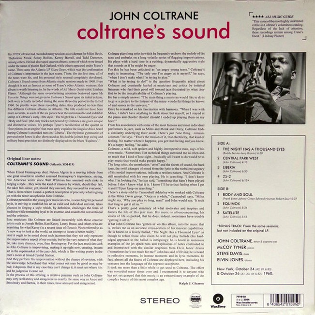 Фірмова вінілова платівка (VINYL)Coltrane's Sound is an album credited to the jazz musician John Coltrane, recorded in 1960 and released in 1964 on Atlantic Records, catalogue SD 1419. It was recorded at Atlantic Studios during the sessions for My Favorite Things, assembled after Coltrane had stopped recording for the label and was under contract to Impulse! Records. Like Prestige and Blue Note Records before them, as Coltrane's fame grew during the 1960s Atlantic used unissued recordings and released them without either Coltrane's input or approval.