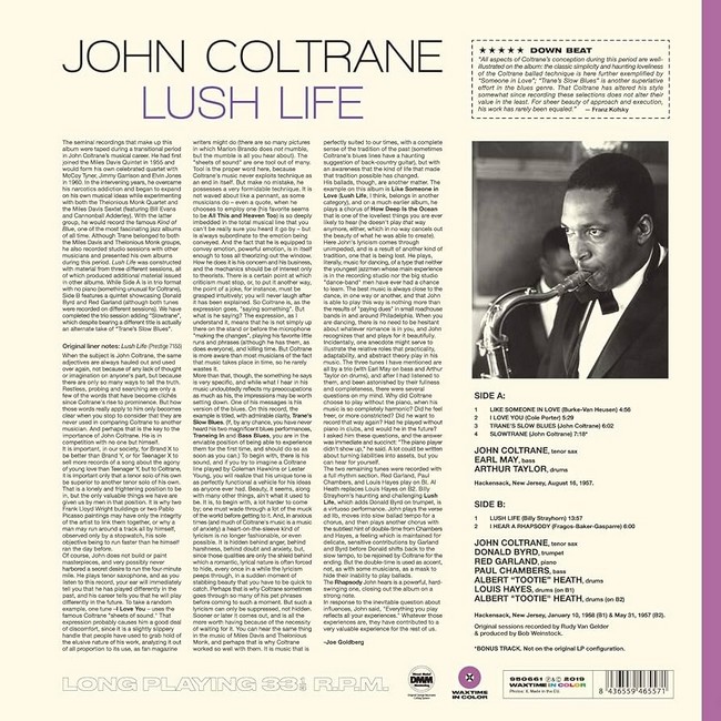 Фірмова вінілова платівка (VINYL)Lush Life is a studio album by the jazz musician John Coltrane. It was released in early 1961 through Prestige Records. It was assembled from previously unissued tracks from three recording sessions at Van Gelder Studio in Hackensack, New Jersey in 1957 and 1958. As Coltrane's profile increased during the 1960s, some years after the end of his Prestige contract, the label used unissued recordings to create new albums without Coltrane's input or approval.
