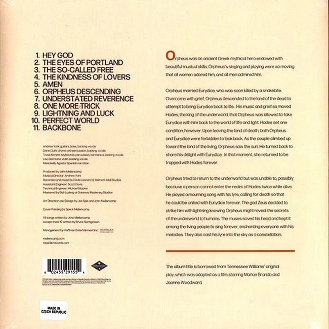 Фірмова вінілова платівка (VINYL)Orpheus Descending is the twenty-fifth studio album by American rock singer-songwriter John Mellencamp, released on June 16, 2023 by Republic Records. The album has received positive reviews from critics and explores personal and political themes.