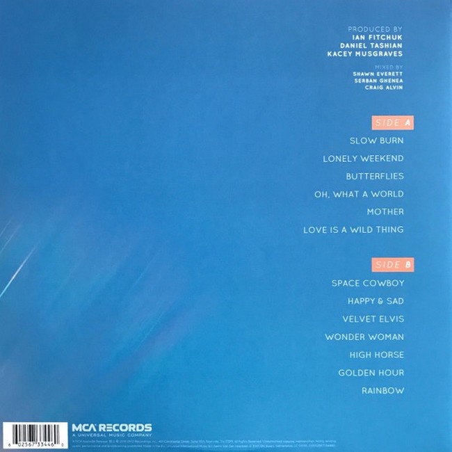 Фірмова вінілова платівка (VINYL)Golden Hour is the fourth studio album by American country music singer and songwriter Kacey Musgraves, released on March 30, 2018, through MCA Nashville. Musgraves co-wrote all 13 tracks and co-produced the album with Daniel Tashian and Ian Fitchuk. A country pop record, Golden Hour also contains elements of disco, electropop, electronica, and yacht rock.