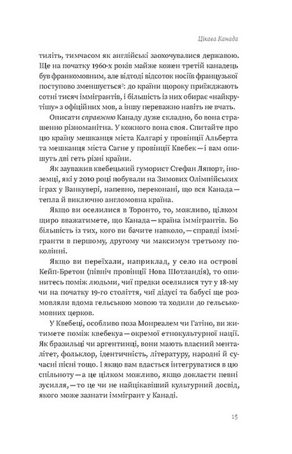Канада — яскрава й самобутня. Кожна провінція — інша, кожен регіон — особливий. Іммігрант у Торонто й іммігрант у Квебеку побачать дві різні країни. Людина з Ванкувера розкаже зовсім іншу історію, ніж людина з Ньюфаундленду. І зроблять вони це, найімовірніше, абсолютно різними мовами.