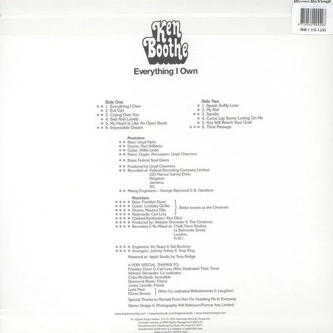 Фірмова вінілова платівка (VINYL)Everything I Own is the seventh studio album by Jamaican recording artist Ken Boothe. It was released in 1974 by Trojan Records. It is not to be confused with the three Ken Boothe compilation albums, Everything I Own (1997), Everything I Own: The Best of Ken Boothe (2003) and Everything I Own: The Definitive Collection (2007).