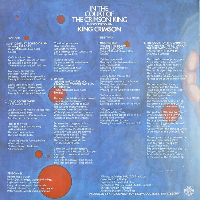 In the Court of the Crimson King (subtitled An Observation by King Crimson) is the debut studio album by English progressive rock band King Crimson, released on 10 October 1969 by Island Records. The album is one of the earliest and most influential of the progressive rock genre, where the band combined the musical influences that rock music was founded upon with elements of jazz, classical, and symphonic music.