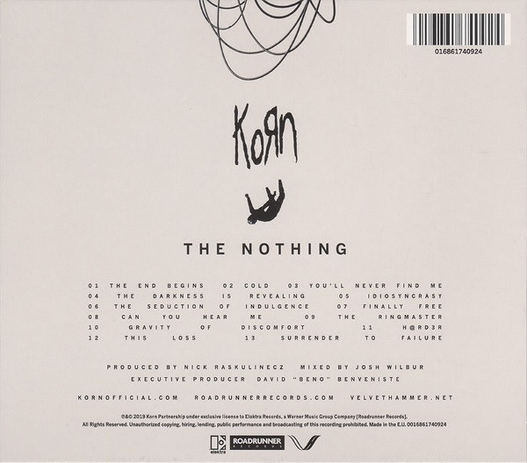 Фірмовий диск (CD)The Nothing is the thirteenth studio album by American nu metal band Korn. It was released on September 13, 2019, through Roadrunner and Elektra. The album was produced by Nick Raskulinecz.