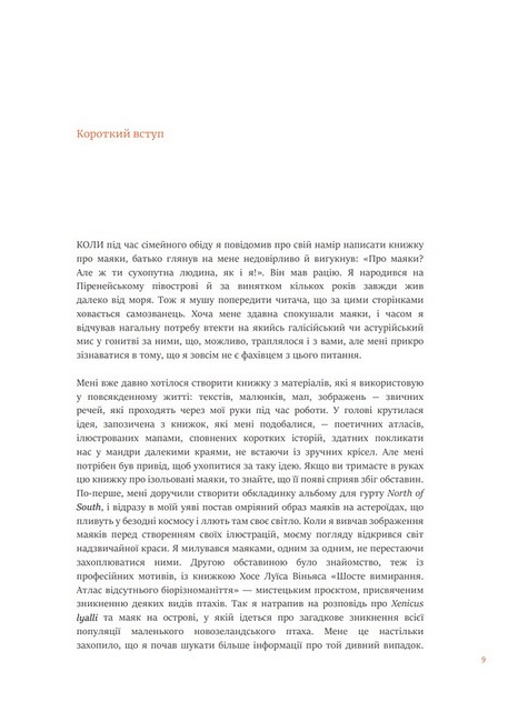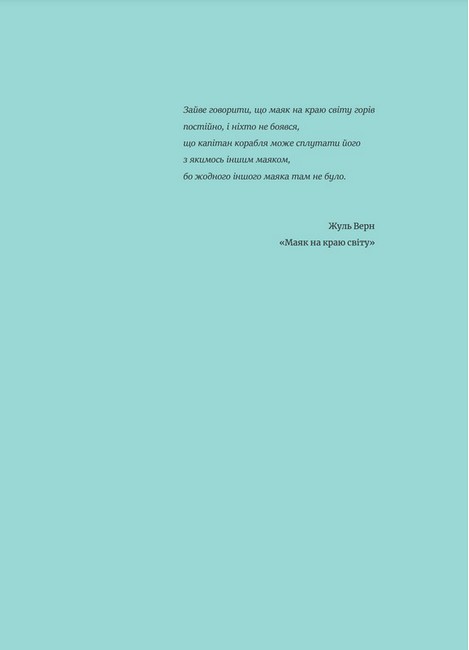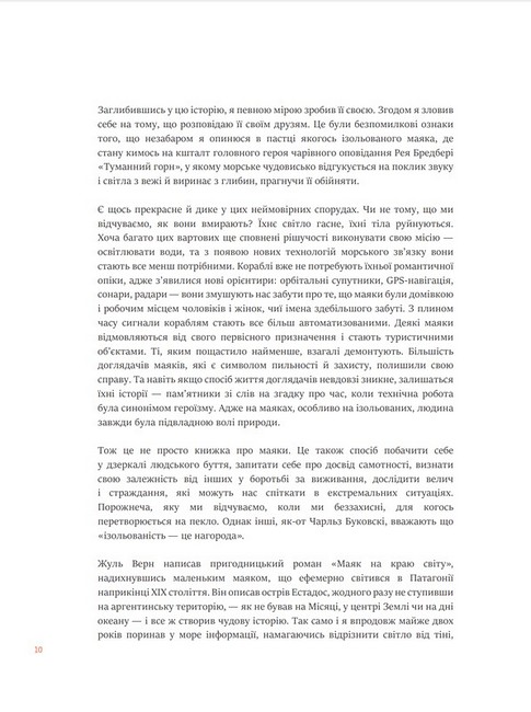 “Є щось прекрасне й дике у цих неймовірних спорудах. Чи не тому, що ми відчуваємо, як вони вмирають? Їхнє світло гасне, їхні тіла руйнуються. Хоча багато цих вартових ще сповнені рішучості виконувати свою місію ? освітлювати води, та з появою нових технологій морського зв’язку вони стають все менш потрібними. Кораблі вже не потребують їхньої романтичної опіки, адже з’явилися нові орієнтири: орбітальні супутники, GPS-навігація, сонари, радари ? вони змушують нас забути про те, що маяки були домівкою і робочим місцем чоловіків і жінок, чиї імена здебільшого забуті. З плином часу сигнали кораблям стають все більш автоматизованими. Деякі маяки відмовляються від свого первісного призначення і стають туристичними об’єктами. Ті, яким пощастило найменше, взагалі демонтують. Більшість доглядачів маяків, які є символом пильності й захисту, полишили свою справу. Та навіть якщо спосіб життя доглядачів невдовзі зникне, залишаться їхні історії ? пам’ятники зі слів на згадку про час, коли технічна робота була синонімом героїзму. Адже на маяках, особливо на ізольованих, людина завжди була підвладною волі природи.”