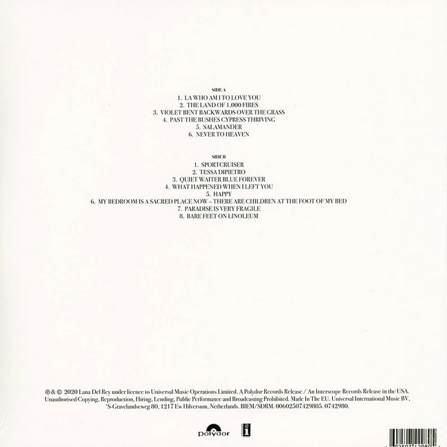 Випущений у 2020 році, "Violet Bent Backwards Over The Grass" являє собою унікальне поєднання поезії, легкої музики та співу. Цей альбом є надзвичайно особистісним та інтимним, пропускаючи через себе всі емоції та переживання Lana, які вона майстерно перетворила у неповторні поетичні лінії.