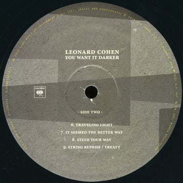 | A1 | You Want It Darker Arranged By [Choral Arrangement] – Adam Cohen, Conor O'neil, Roi Azoulay Choir – Congregation Shaar Hashomayim Synagogue Choir Conductor – Roi Azoulay Drums – Rob Humphreys Electric Organ [B3 Organ] – Neil Larsen Engineer – Bill Bottrell, Howard Bilerman, Michael Chaves Keyboards – Michael Chaves Keyboards [Keyboard Bass], Electric Organ [B3 Organ] – Patrick Leonard Mixed By – Michael Chaves Music By – Patrick Leonard Producer [Produced By] – Adam Cohen Soloist – Cantor Gideon Y. Zelermyer Words By – Leonard Cohen | |